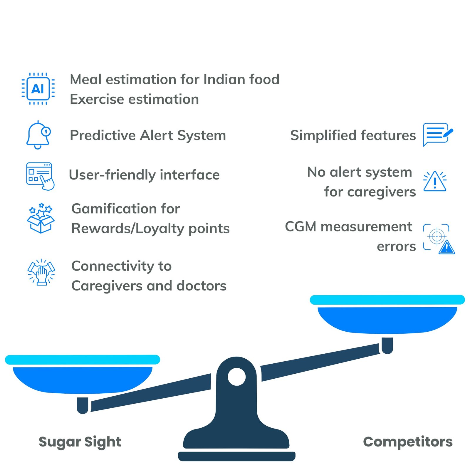 Sugar Sight Fact: Diabetes Impacts Millions Globally and Current Solutions Are Ineffective! Sugar Sight Source: Diabetes Atlas 2024 Current Global Diabetes Prevalence 589 Million Web Designer By the Year 2050 853 Million Web Designer Source : ICMR-INDIAB Study Enhance the experience with a CGM Accurate Measurements Correction of Sensor Error to match blood glucose Continuous Usage (2 per month) Once every quarter Use Glucometer for calibration (6 samples) Doctor Consultation In-App video consultationIn-App prescriptionPatient history and TestsChat with Doctors/Nutritionists Logging and Challenges Real-time Alert System Hypo/Hyper glycemia alert Alerts Caregivers/parents and Doctors immediately Exercise Assistant AI Meal Estimation Indian Meal DatabaseCalorie, Carbohydrate, Protein, Fat value USP of Sugar Sight Benefits to Users Diabetes Simplified Countdown to Sugar Sight Sugar Sight App will be available on Frequent & Accurate Glucose Measurements Predictive Alert System Doctor Consultation Exercise Assistant AI Meal Estimation Logging and Challenges